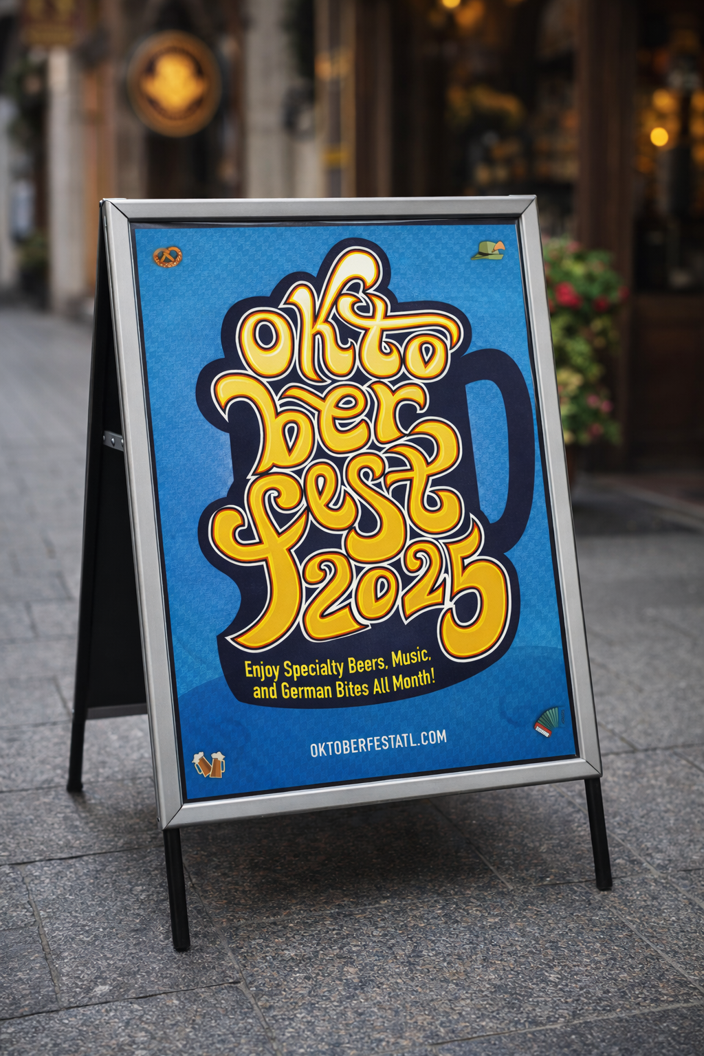This poster celebrates the vibrant spirit of Oktoberfest! With intertwined lettering, bold German colors, the iconic beer stein, and a frothy pint, the design comes alive against the checkered Munich flag and touches of traditional folk art, a playful tribute to the festival’s Bavarian roots. Prost!